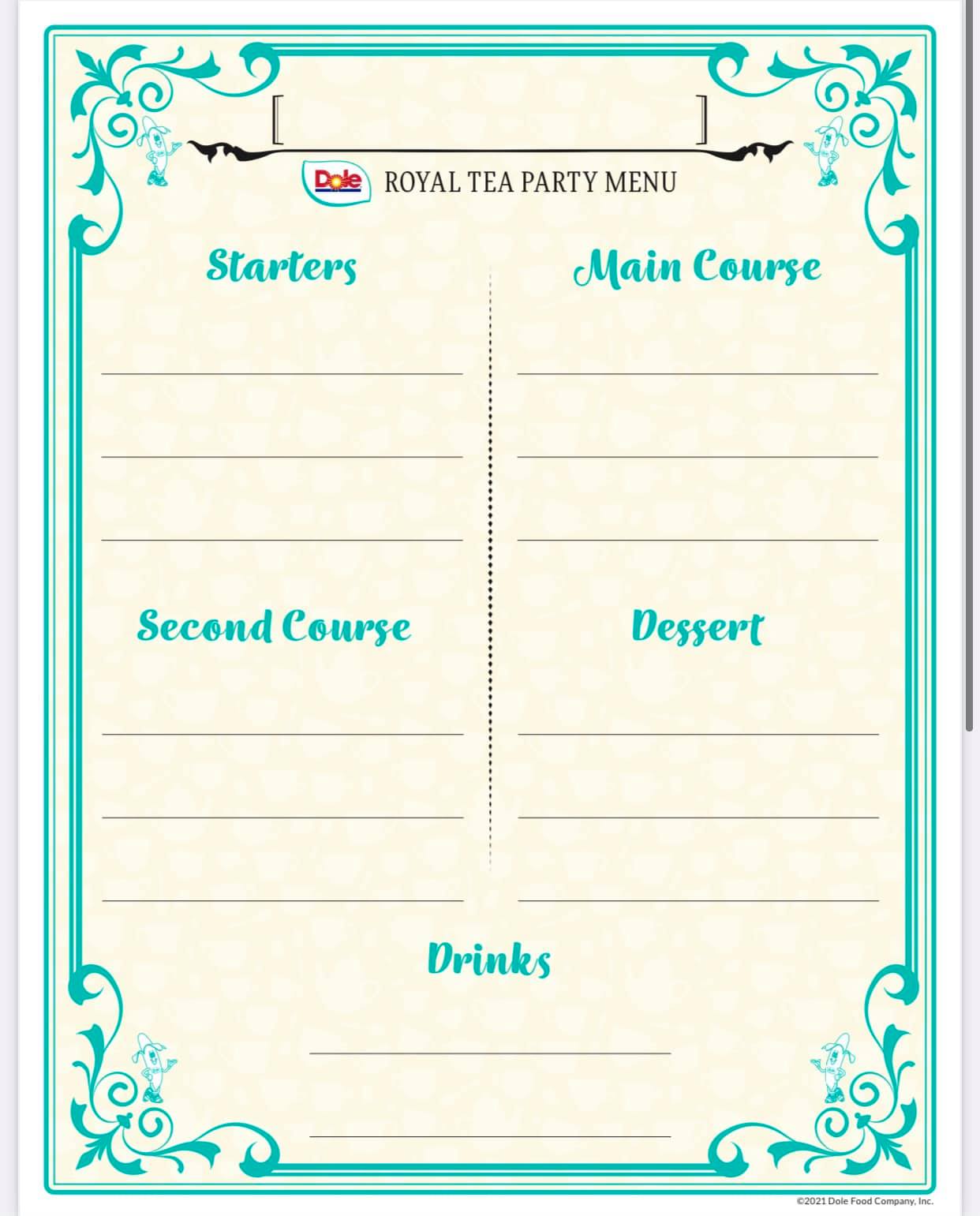 In the meantime, head to Dole’s website at Dole.com/Disney to download a Dole Royalty Certificate, a Royal Tea Party Placemat, a Create Your Own Royal Tea Party Menu, a Dole’s Royal Chef’s Hat, and a PRINTABLE BANANA STICKER PEEL & PLAY STORY BOOK!